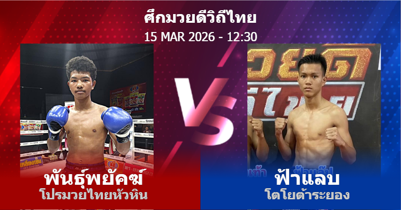 15/03/2026 12:30 ศึกมวยดีวิถีไทย ช่วงที่ 2 พันธุ์พยัคฆ์ โปรมวยไทยหัวหิน ฟ้าแลบ โตโยต้าระยอง