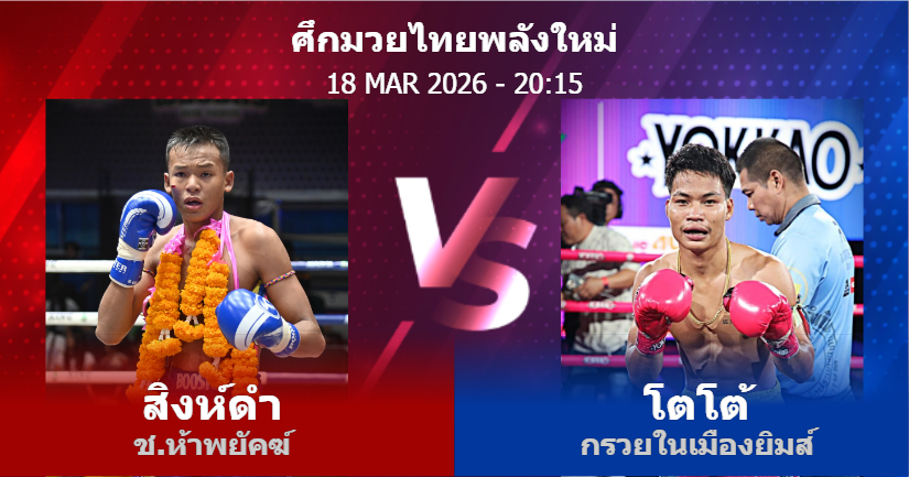 18/03/2026 20:30 ศึกมวยไทยพลังใหม่ ช่วงที่ 2 สิงห์ดำ ช.ห้าพยัคฆ์ โตโต้ กรวยในเมืองยิมส์