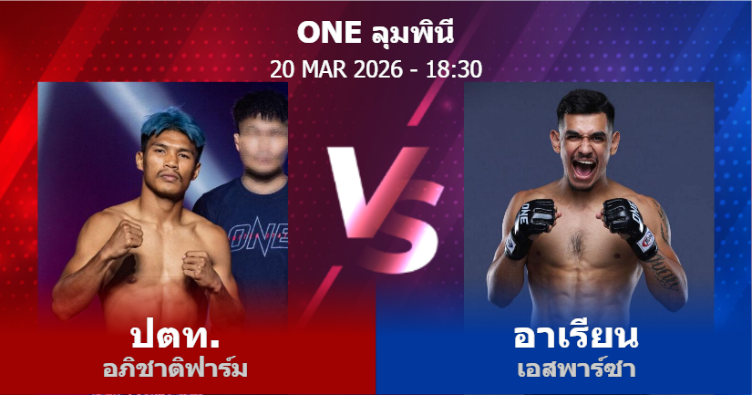 20/03/2026 18:30 ศึกวันแชมเปียนชิพลุมพินีมวยไทย รุ่นเฟเธอร์เวต ปตท. อภิชาติฟาร์ม อาเรียน เอสพาร์ซา