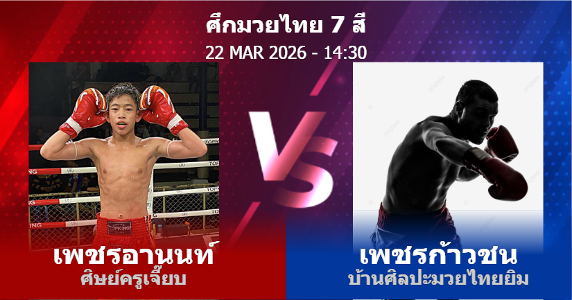 22/03/2026 14:30 ศึกมวยไทย 7 สี เพชรอานนท์ ศิษย์ครูเจี๊ยบ เพชรก้าวชน บ้านศิลปะมวยไทยยิม