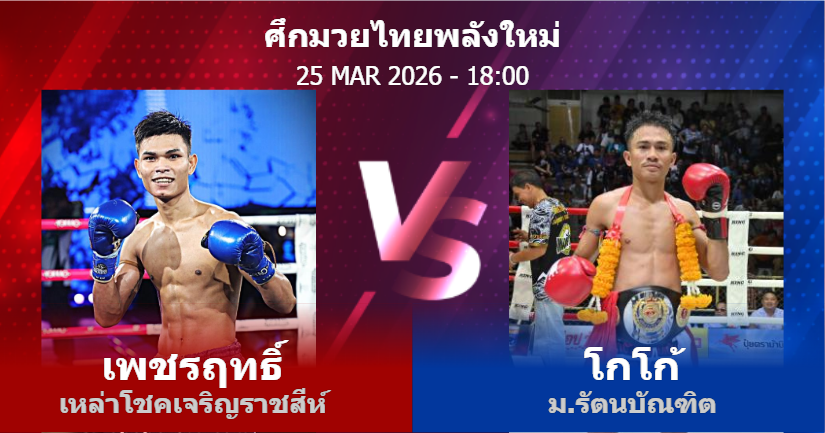 25/03/2026 18:00 ศึกมวยไทยพลังใหม่ เพชรฤทธิ์ เหล่าโชคเจริญราชสีห์ โกโก้ ม.รัตนบัณฑิต