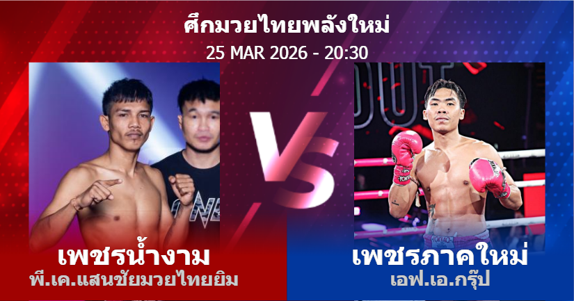 25/03/2026 20:30 ศึกมวยไทยพลังใหม่ ช่วงที่ 2 เพชรน้ำงาม พี.เค.แสนชัยมวยไทยยิม เพชรภาคใหม่ เอฟ.เอ.กรุ๊ป
