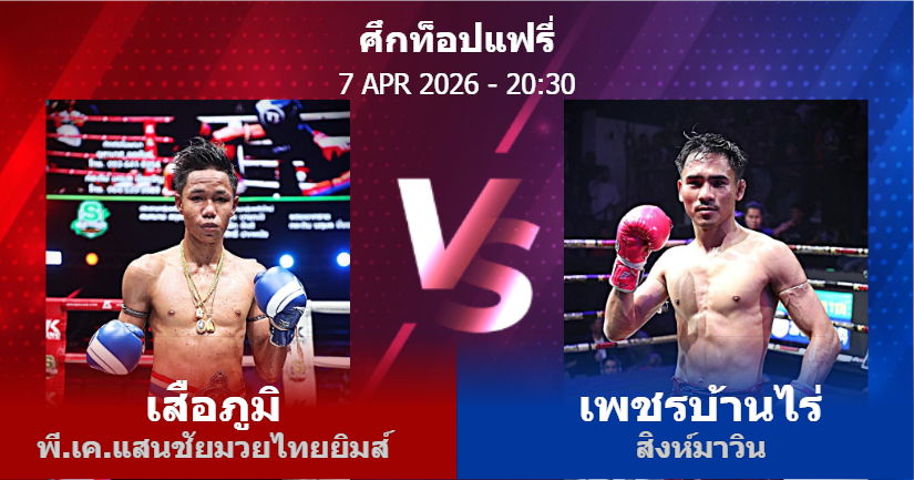 07/04/2026 20:30 ศึกท็อปแฟรี่ยิม ช่วงที่ 2 เสือภูมิ พี.เค.แสนชัยมวยไทยยิมส์ เพชรบ้านไร่ สิงห์มาวิน