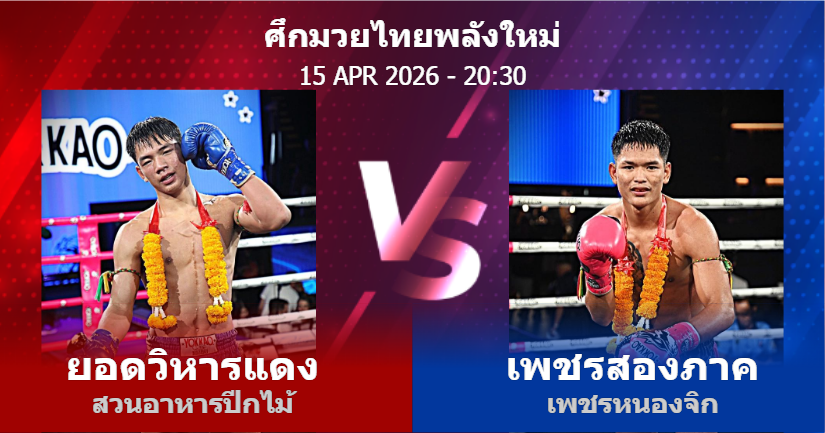 15/04/2026 20:30 ศึกมวยไทยพลังใหม่ ช่วงที่ 2 ยอดวิหารแดง สวนอาหารปีกไม้ เพชรสองภาค เพชรหนองจิก
