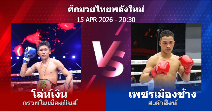 15/04/2026 20:30 ศึกมวยไทยพลังใหม่ ช่วงที่ 2 โล่ห์เงิน กรวยในเมืองยิมส์ เพชรเมืองช้าง ส.คำสิงห์