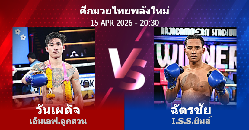 15/04/2026 20:30 ศึกมวยไทยพลังใหม่ ช่วงที่ 2 วันเผด็จ เอ็นเอฟ.ลูกสวน ฉัตรชัย I.S.S.ยิมส์