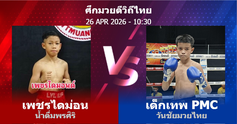 26/04/2026 10:30 ศึกมวยดีวิถีไทย เพชรไดม่อน น้ำดื่มพรศิริ เด็กเทพ PMC.วันชัยมวยไทย