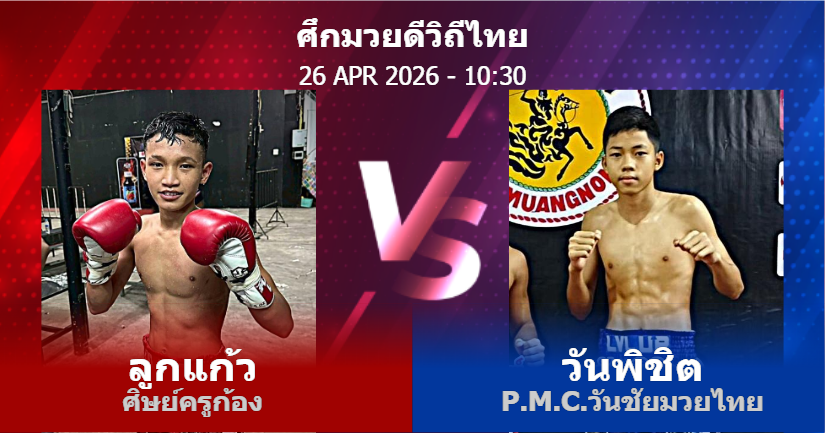 26/04/2026 10:30 ศึกมวยดีวิถีไทย ลูกแก้ว ศิษย์ครูก้อง วันพิชิต P.M.C.วันชัยมวยไทย