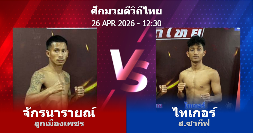 26/04/2026 12:30 ศึกมวยดีวิถีไทย ช่วงที่ 2 จักรนารายณ์ ลูกเมืองเพชร ไทเกอร์ ส.ซากีฟ