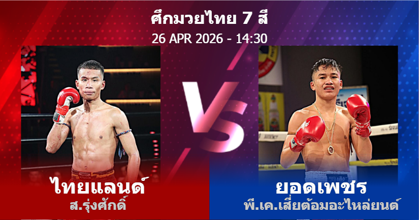 26/04/2026 14:30 ศึกมวยไทย 7 สีศึกมวยปูนเสือ ตัวที่ 25 สาย D ไทยแลนด์ ส.รุ่งศักดิ์ ยอดเพชร พี.เค.เสี่ยต้อมอะไหล่ยนต์