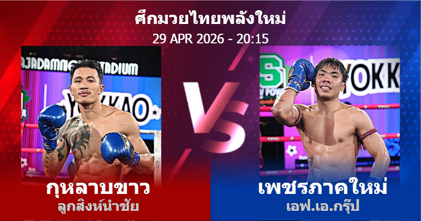 29/04/2026 20:15 ศึกมวยไทยพลังใหม่ ช่วงที่ 2 กุหลาบขาว ลูกสิงห์นำชัย เพชรภาคใหม่ เอฟ.เอ.กรุ๊ป