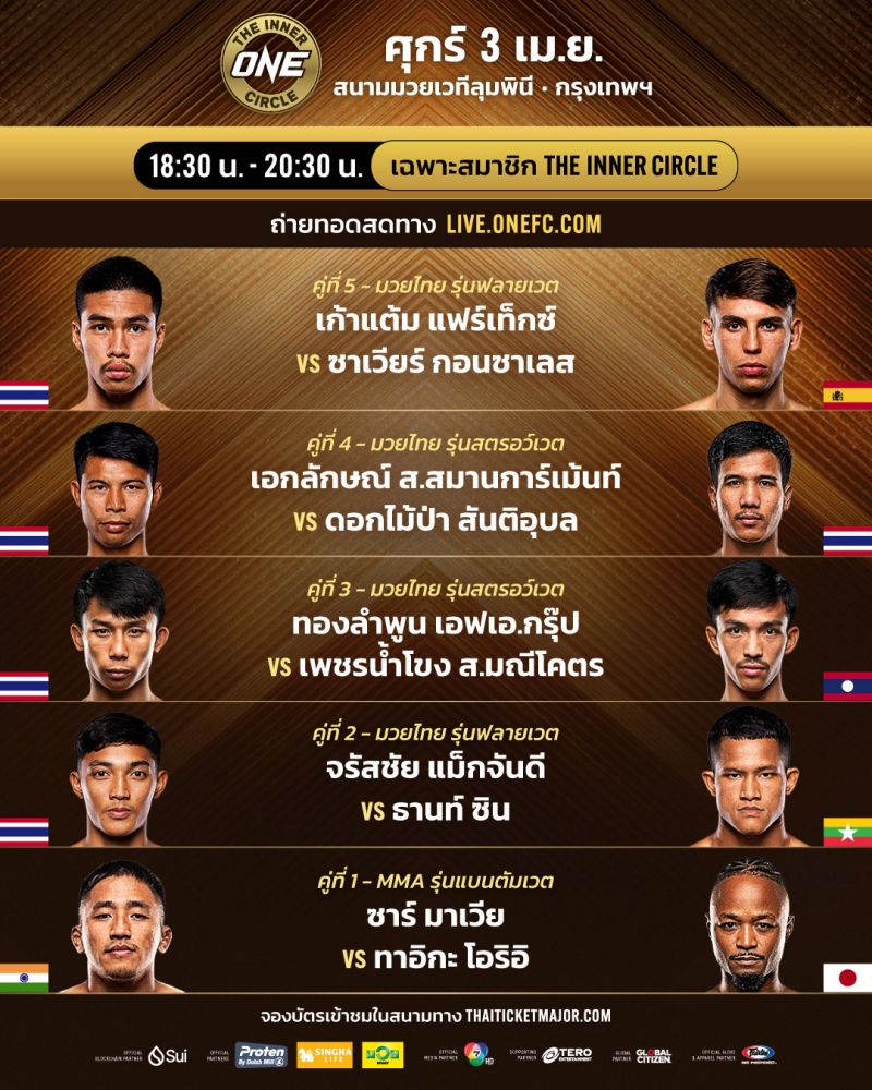 The Inner Circle จองบัตรเข้าชมในสนามผ่านทาง THAI TICKET MAJOR สำหรับผู้ชมทางบ้าน สามารถรับชมการถ่ายทอดสด ในช่วงเวลา 18.30 น. – 20.30 น. ทาง LIVE.ONEFC.com สงวนสิทธิ์เฉพาะสมาชิกเท่านั้น ดูรายละเอียดการสมัครสมาชิกได้ที่ลิงก์นี้ ONEFC.com
