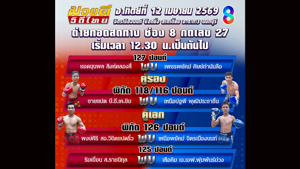 แฟนมวยเตรียมเฮช่อง 8 ขนทัพนักชกฝีมือดีระเบิดศึกมวยไทย 5 ยก รับเทศกาลสงกรานต์วันอาทิตย์นี้