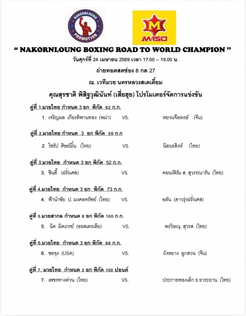 สำหรับคู่มวยที่น่าสนใจในรายการนี้ประกอบด้วยการเจอกันระหว่าง เจริญผล เกียรติพานทอง จากเมียนมา พบกับ หยวนจือหงษ์ จากจีน และการปะทะกันของนักชกสาวเหล็ก ซินดี้ จากฝรั่งเศส ดวลกับ คอนเฟิร์ม ส.สุวรรณารัน นอกจากนี้ยังมีมวยสากลพิกัดยักษ์ 100 กิโลกรัมระหว่าง นิค มิตเกรย์ จากออสเตรเลีย กับ พรวิษณุ สุวรส ร่วมสร้างสีสันปิดท้ายรายการ โดยเสี่ยฮุยยืนยันว่าการจัดมวยไทยเป็นหลักในเดือนนี้ถือเป็นกรณีพิเศษเพื่อคืนความสุขให้แฟนกีฬาและส่งเสริมซอฟต์พาวเวอร์ของไทยสู่สายตาโลก แฟนมวยสามารถรับชมการถ่ายทอดสดได้ทางช่อง 8 หมายเลข 27 ตั้งแต่เวลา 17.00 น. เป็นต้นไป