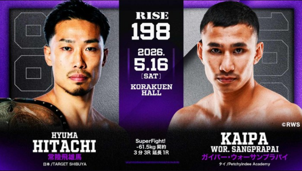 สังเวียนโครักคุเอน ฮอลล์ ในกรุงโตเกียวเตรียมลุกเป็นไฟเมื่อศึก RISE 198 ประกาศคู่มวยระดับซูเปอร์ไฟต์ พิกัด 61.5 กิโลกรัม นำทัพโดย ไก่ป่า ว.สังข์ประไพ อดีตแชมป์ราชดำเนินเจ้าของเพลงเข่าอันดุดันจากค่ายเพชรยินดี อะคาเดมี่ เดินทางข้ามประเทศไปท้าชน ฮิวมะ ฮิตาชิ ยอดฝีมือเจ้าถิ่นดีกรีแชมป์รุ่นซูเปอร์เฟเธอร์เวทจากสังกัด TARGET SHIBUYA ในวันเสาร์ที่ 16 พฤษภาคม 2026