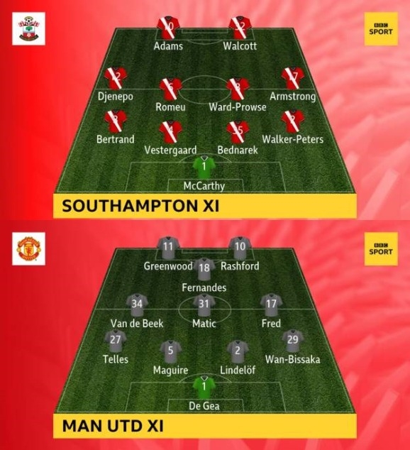 เกมที่สนามเซนต์ แมรี่ส์ สเตเดี้ยม โอเล่ กุนนาร์ โซลชา กุนซือ แมนเชสเตอร์ ยูไนเต็ด เลือกที่จะปรับทีมเพียงเล็กน้อยส่ง กรีนวูด กับ มาติช ลงตัวจริง ส่วนสองคนที่หลุดคือ เอดินซอน คาวานี่ กลับไปนั่งสำรอง และ อ็องโตนี่ มาร์กซิยาล หายหน้าไปจากทีมทั้งที่ม้านั่งสำรองด้วย
