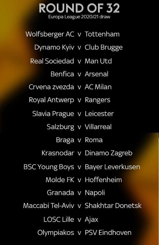 สหพันธ์ฟุตบอลยุโรป หรือ ยูฟ่า จับสลากประกบคู่ ยูโรปาลีก รอบ 32 ทีมสุดท้าย ปรากฏว่าคู่เอกอยู่ที่ แมนเชสเตอร์ ยูไนเต็ด โคจรมาเจอกับ เรอัล โซเซียดาด ขณะที่ อาร์เซน่อล งานหนักไม่แพ้กัน เจอกับ เบนฟิก้า