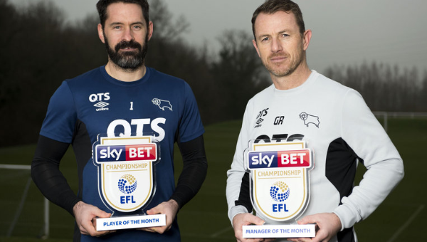 แกรี่ โรเว็ตต์ ผู้จัดการทีม ดาร์บี้ เคาน์ตี้ จูงมือลูกทีม สกอตต์ คาร์สัน อดีตผู้รักษาประตูทีมชาติอังกฤษ คว้ารางวัลยอดเยี่ยมประจำเดือนธันวาคมของศึกแชมเปี้ยนชิพ