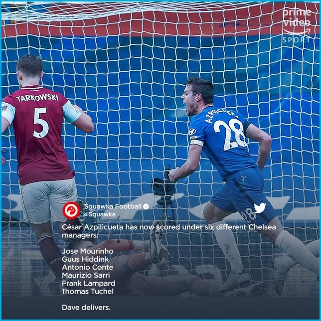 ‘เดฟ’ ยิงประตูให้ผู้จัดทีม/เฮดโค้ช เชลซี แล้วถึงหกคนได้แก่ ทูเคิ่ล, แฟร้งค์ แลมพาร์ด, เมาริซิโอ ซาร์รี่, อันโตนิโอ คอนเต้, กุส ฮิดดิ้งค์ และ โชเซ่ มูรินโญ่