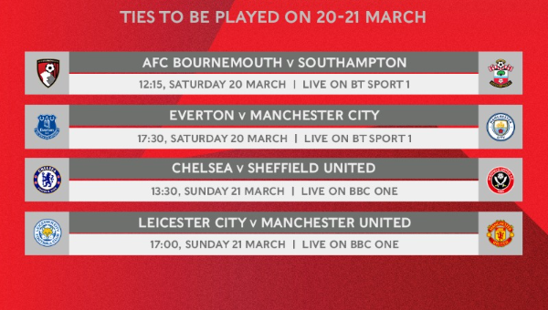 ล่าสุดเมื่อวันจันทร์ที่ผ่านมา เอฟเอ ออกโปรแกรมรอบ 8 ทีมสุดท้าย โดยคู่แรก บอร์นมัธ ลงดวลกับ เซาธ์แฮมป์ตัน เวลา 19.15 น. ของวันเสาร์ที่ 20 มีนาคม ตามเวลาไทย ต่อด้วยคู่ดึกเวลา 00.30 น. เป็นการดวลกันระหว่าง เอฟเวอร์ตัน ที่จะเปิดบ้านรับมือ แมนเชสเตอร์ ซิตี้