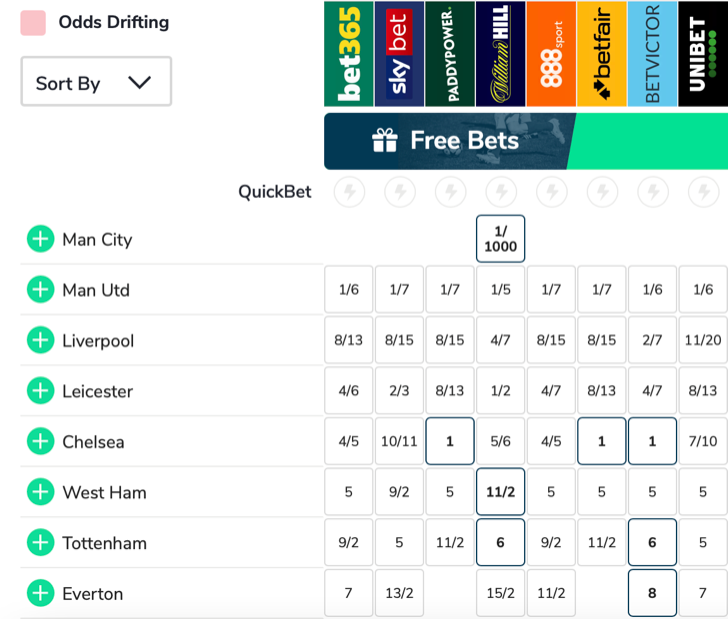 ด้านรองๆลงไปคือ เวสต์แฮม (11/2), ท็อตแน่ม (6/1)และ เอฟเวอร์ตัน (15/2)ต่อให้เหลือเกมตกค้างก็ตาม