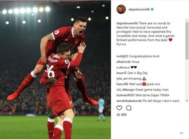 "บางทีนี่อาจจะเป็นเพียงแค่ครั้งเดียวเท่านั้นที่ผมจะได้สวม แต่มันก็เพียงพอแล้ว มันถือเป็นเกียรติอย่างยิ่งที่ได้เป็นตัวแทนของสโมสรอย่าง ลิเวอร์พูล" ทั้งนี้เจ้าตัวยังโพสต์ภาพลงอินสตาแกรม @dejanlovren06 ให้ฟินอีกทาง