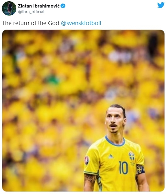ด้าน อิบราฮิโมวิช ก็โพสต์ทวิตเตอร์ว่า "การกลับมาของพระเจ้า @svenskfotboll" เป็นการยืนยันการกลับคืนทีมชาติในวัย 39 ปีเช่นกัน