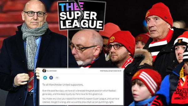 โจเอล เกลเซอร์ ประธานสโมสรร่วมของ แมนฯ ยูไนเต็ด ออกมาร่อนจดหมายขอโทษแฟนบอล หลังเป็นหนึ่งในแรงขับเคลื่อนในการก่อตั้งยูโรเปี้ยน ซูเปอร์ ลีก ที่ตอนนี้แทบจะล่มเรียบร้อยแล้ว