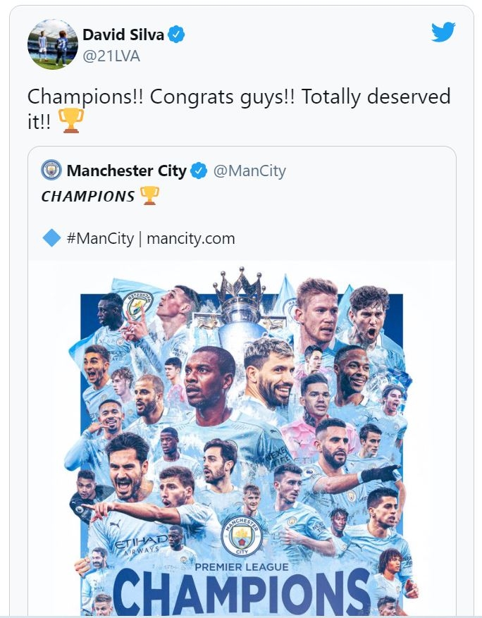 นอกจากนี้ ดาบิด ซิลบา ตำนานของทีมที่เพิ่งย้ายออกไปในซัมเมอร์ที่แล้ว ก็ไม่ลืมร่วมยินดีกับเพื่อนเก่าในความสำเร็จครั้งนี้ โดยรีทวีตโพสต์ฉลองแชมป์ของทีมพร้อมกับแคปชั่นว่า "แชมเปี้ยน ยินดีกับพวกนายด้วย คู่ควรอย่างยิ่ง!!"