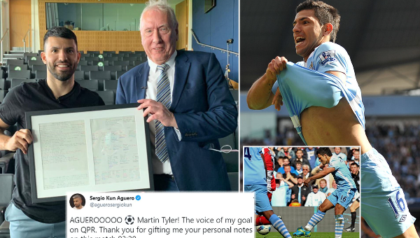 มาร์ติน ไทเลอร์ ผู้บรรยายหลักพรีเมียร์ลีก อังกฤษ แห่งค่าย สกาย สปอร์ตส์ มอบกระดาษโน้ตใส่กรอบจากเกมปิดซีซั่น 2012 แสนคลาสสิคเป็นของขวัญที่ระลึกแก่ เซร์คีโอ อเกวโร่ กองหน้า แมนฯ ซิตี้ ซึ่งกำลังจะหมดสัญญาลาถิ่น เอติฮัด สเตเดี้ยม สิ้นฤดูกาลนี้ สร้างความประทับใจแก่แข้งอาร์เจนไตน์อย่างมาก