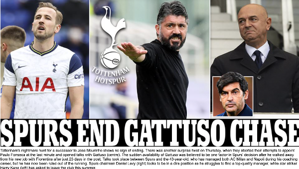 สโมสร ท็อตแน่ม ฮอตสเปอร์ ล้มเลิกดำเนินการทาบทาม เจนนาโร่ กัตตูโซ่ กุนซือว่างงานให้เข้ามาเป็นเฮดโค้ชคนใหม่แล้ว นับเป็นตัวเลือกล่าสุดที่เจรจาล้มเหลวสำหรับการสานต่องานแทนที่ โชเซ่ มูรินโญ่ บอสคนเก่า