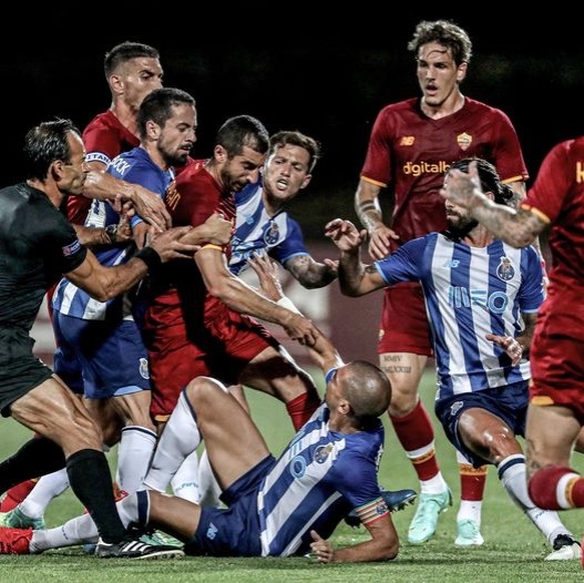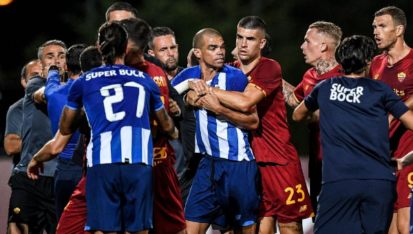 เปเป้ กองหลังวัย 38 ปีของ ปอร์โต้ ยังเล่นหยาบไม่เปลี่ยนอัดหนักใส่ เฮนริค มคิทาร์ยาน ในเกมอุ่นเครื่องกับ โรม่า จนเกือบจุดชนวนการทะเลาะวิวาทของนักเตะทั้งสองทีม