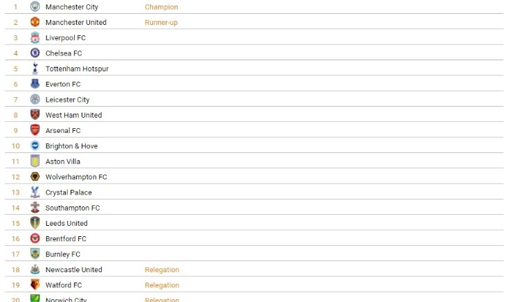 ส่วนตำแหน่งแชมป์ยังเป็น 'เรือใบสีฟ้า' ปิดท้ายรองแชมป์ แมนฯ ยูไนเต็ด นั่นหมายความว่าท็อปโฟร์อันดับเหมือนเดิม