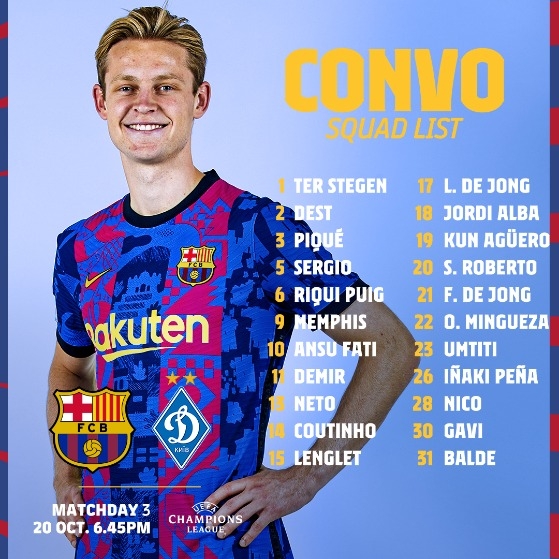 โรนัลด์ คูมัน เทรนเนอร์ บาร์เซโลน่า ประกาศรายชื่อในเกมสำคัญรับการมาเยือนของ ดินาโม เคียฟ เพราะหากยังไม่สามารถเก็บชัยได้อีก ก็มีโอกาสตกรอบสูง