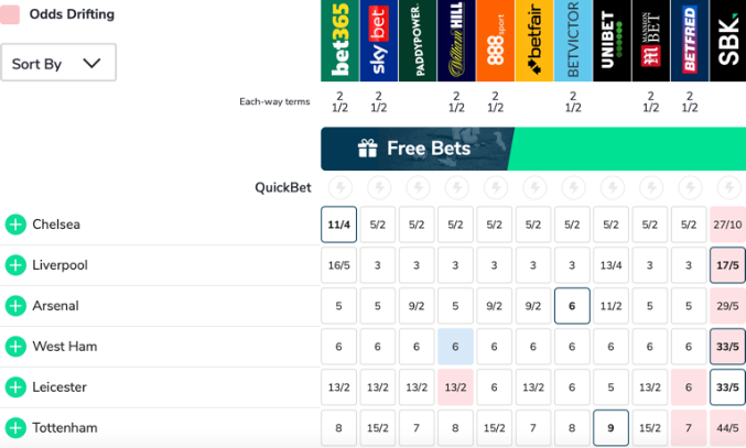 เต็งรองๆลงมาได้แก่ อาร์เซน่อล (5/1), เวสต์แฮม (6/1), เลสเตอร์ (13/2), สเปอร์ส (8/1), เบรนท์ฟอร์ด (16/1)และ ซันเดอร์แลนด์(66/1) ทีมเดียวที่ไม่ได้อยู่บนลีกสูงสุด