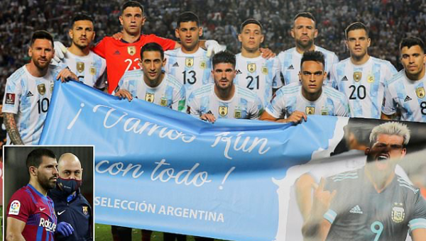 ลิโอเนล เมสซี่ กองหน้ากัปตันทีมชาติอาร์เจนตินาเป็นตัวตั้งตัวตีในการส่งพิมพ์ป้ายไวนิลส่งข้อความให้กำลังใจ เซร์คีโอ อเกวโร่ กุน ทีมเมตฟ้า-ขาว ที่เวลานี้รักษาภาวะหัวใจเต้นผิดปกติอยู่ ก่อนเกมฟีฟ่า เวิล์ด คัพ 2022 รอบคัดเลือกซึ่งเสมอ บราซิล 0-0