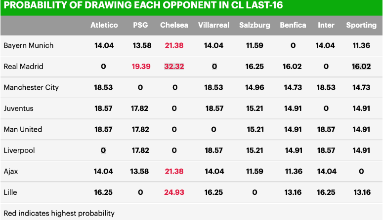 สโมสร เชลซี มีโอกาสสูงถึง 32.3% ที่จะถูกจับสลากให้โคจรไปพบกับ เรอัล มาดริด ในรอบ 16 ทีม แชมเปี้ยนส์ ลีก จันทร์หน้าด้วยเงื่อนไขความเป็นไปได้ ขณะที่ทีม มหาชน แมนฯ ยูไนเต็ด มีลุ้นชนของแข็งอย่าง แอต.มาดริด และ อินเตอร์ มิลาน