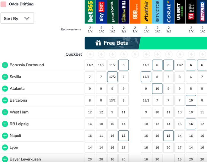 ค่ายอื่นที่น่าจับตาเช่น อตาลันต้า เต็งสี่ (9/1), เวสต์แฮม เต็งห้า (11/1) ไปรอในรอบ 16 ทีมสุดท้ายแล้ว, ไลป์ซิก เต็งหก (14/1) และ นาโปลี เต็งเจ็ดร่วมกับ ลียง (18/1)