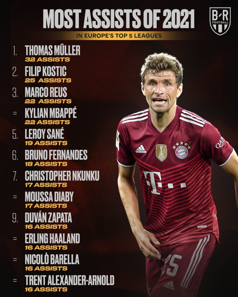 โธมัส มุลเลอร์ แข้งจอมเก๋าของ บาเยิร์น มิวนิค เป็นผู้เล่นที่ทำแอสซิสต์มากสุดของ 5 ลีกใหญ่ ในปี 2021 ที่ผ่านมา