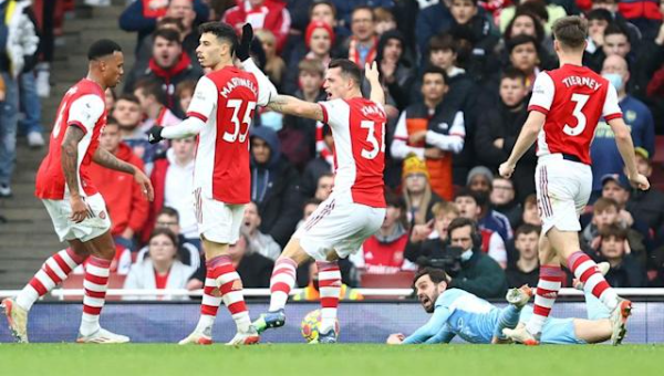 เกมที่เอมิเรตส์ สเตเดี้ยมเป็น "ปืนใหญ่" ที่นำก่อนจาก บูคาโย่ ซาก้า ในนาทีที่ 31 ก่อนหน้านั้นมีจังหวะที่ มาร์ติน โอเดการ์ด เข้าเขตโทษ ด้านขวาก่อนหนี เอแดร์ซอน แล้วล้มลงไปแต่ผู้ตัดสิน สจ๊วร์ต แอ็ตต์เวลล์ ให้เล่นต่อซึ่งเช็กวีเออาร์แล้วก็ไม่เป็นจุดโทษ