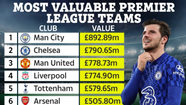 ด้าน เชลซี แซงขึ้นมารั้งในอันดับ 2 ด้วยมูลค่า 790.65 ล้านปอนด์ ขณะที่ แมนฯ ยูไนเต็ด หล่นมาอันดับ 3 ที่ 778.73 ล้านปอนด์ ตามด้วย ลิเวอร์พูล ที่ 774.90 ล้านปอนด์