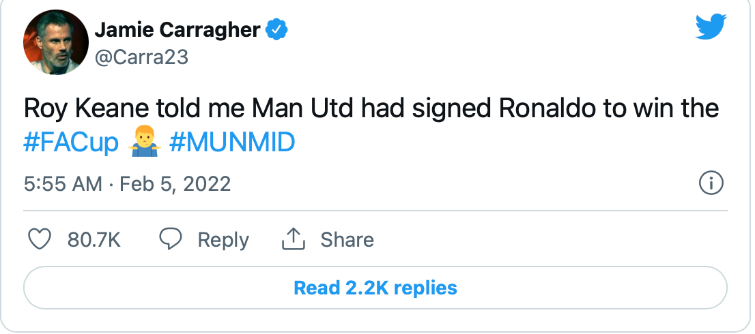 “รอย คีน บอกผมว่า แมนฯ ยูไนเต็ด เซ็น โรนัลโด้ มาเพื่อคว้าแชมป์เอฟเอ คัพ” คาร์ราเกอร์ ทวีตผ่านบัญชี @Carra23 ซึ่งก็โดนรีทวีตกว่า 12,000 ครั้ง แล้วอีกร่วม 2,100 ความเห็น ซึ่งส่วนใหญ่ก็ร่วมขำกับทวีตของอดีตรองกัปตัน ลิเวอร์พูล