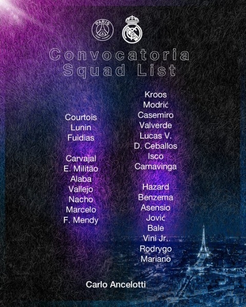 คาร์โล อันเชล็อตติ เทรนเนอร์ชาวอิตาเลียน ประกาศรายชื่อทีมออกมาตั้งแต่วันอาทิตย์แล้ว มีชื่อ คาริม เบนเซม่า ศูนย์หน้าคนสำคัญหายเจ็บกลับมาอยู่ในทีมแล้ว และเป็น 1 ใน 26 นักเตะที่ออกเดินทางไปเล่นเกมเยือน ปารีส แซงต์-แชร์กแม็ง