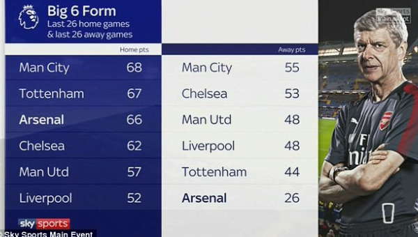 ทว่ากลับกันผลงานเกมเยือนทำได้แค่ 26 แต้ม จากการลงเล่นยี่สิบหกนัดฐานะทีมเยือน น้อยกว่า เชลซี และ แมนฯ ซิตี้ ถึงสองเท่า