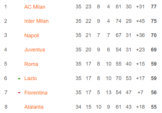สรุปโควตา 4 ทีมอิตาลีที่จะได้เล่นในถ้วยยุโรปฤดูกาลหน้าประกอบด้วย เอซี มิลาน, อินเตอร์ มิลาน, นาโปลี และ ยูเวนตุส