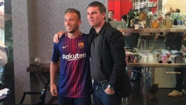 โรเบิร์ต เฟร์นานเดซ เลขาธิการฝ่ายเทคนิคของ บาร์เซโลน่า กับ อาร์ตูร์ มิดฟิลด์คนใหม่ของทีมอาซูลกราน่าหลังสื่อยันว่าการเจรจาบรรลุข้อตกลงแล้ว