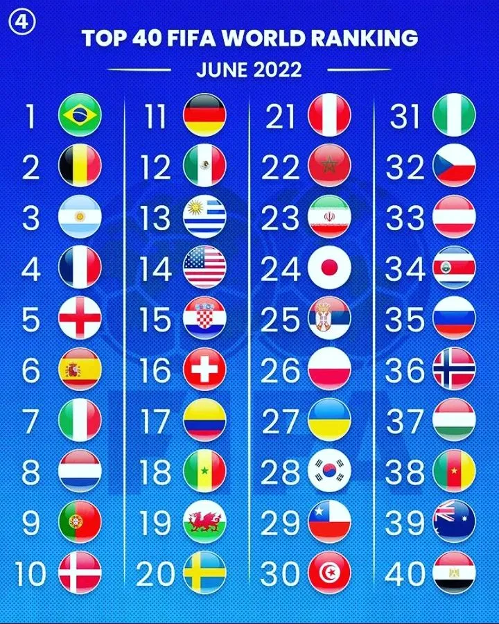 ด้าน อิตาลี แชมป์ยูโร 2020 แต่พลาดตั๋วลุยฟุตบอลโลก 2022 หล่นจากอันดับ 6 ไปอันดับ 7 โดย สเปน แซงขึ้นไป เช่นเดียวกับ โปรตุเกส ที่หล่นจากอันดับ 8 ไปอันดับ 9 โดยเป็น ฮอลแลนด์ ที่แซงขึ้นไป