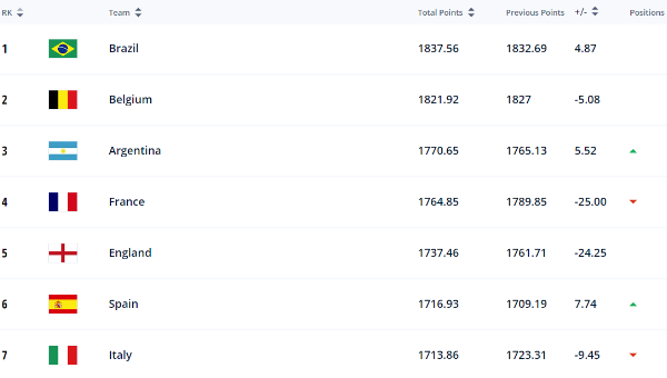 ส่วนอันดับ 3 เป็น อาร์เจนติน่า ที่ขยับแซงหน้า ฝรั่งเศส ขึ้นมาด้วยการมี 1,770.65 คะแนน เพิ่มขึ้น 5.52 คะแนน ขณะที่ทัพ "ตราไก่" ที่หล่นลงมาอันดับ 4 มี 1,764.85 คะแนน ลดลงถึง 25 คะแนน