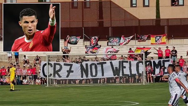 แฟนบอล แอตเลติโก มาดริด แสดงพลังขึ้นป้ายผ้าคัดค้านการนำ คริสเตียโน่ โรนัลโด้ กองหน้า แมนฯ ยูไนเต็ด มาร่วมงานในตลาดซัมเมอร์ 2022 เพราะจะทำลายอัตลักษณ์สโมสร