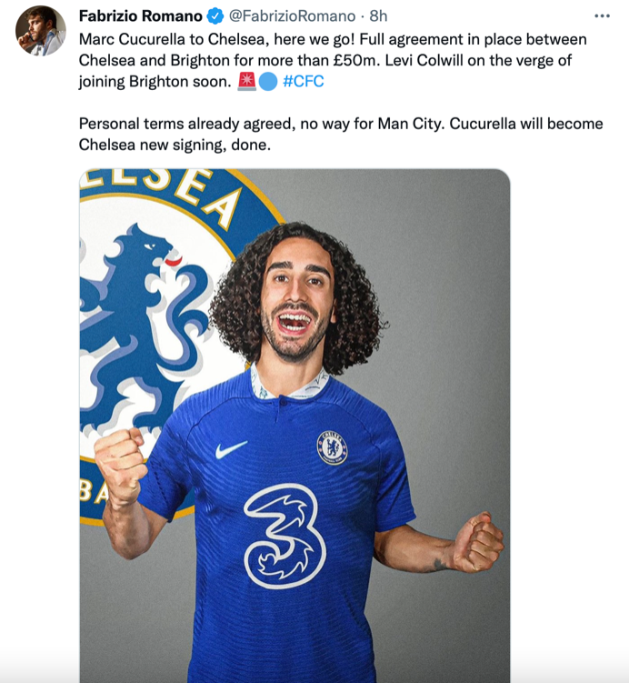 ต้นเรื่องจาก ฟาบริซิโอ โรมาโน่ นักข่าวสายซื้อ-ขายที่วงการลูกหนังโลกให้การยอมรับทวีตอ้างว่า ‘นกนางนวล’ ตกลงรับข้อเสนอซื้อแบ็กซ้ายวัย 24 ปีจาก เชลซี ด้วยตัวเลขเกิน 50 ล้านปอนด์